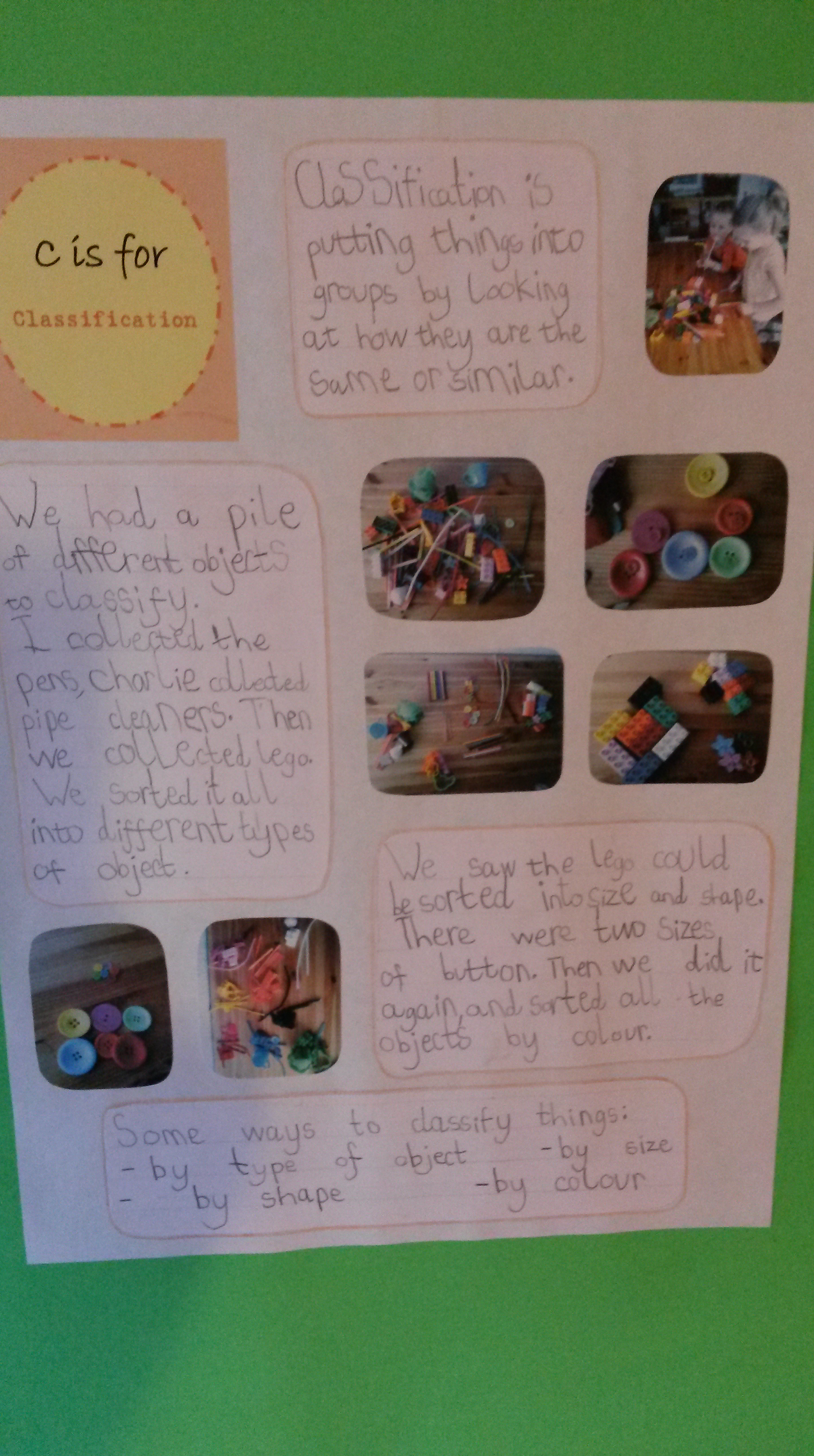 They sorted the lego by size and shape, and the buttons by size, and then by colour.
