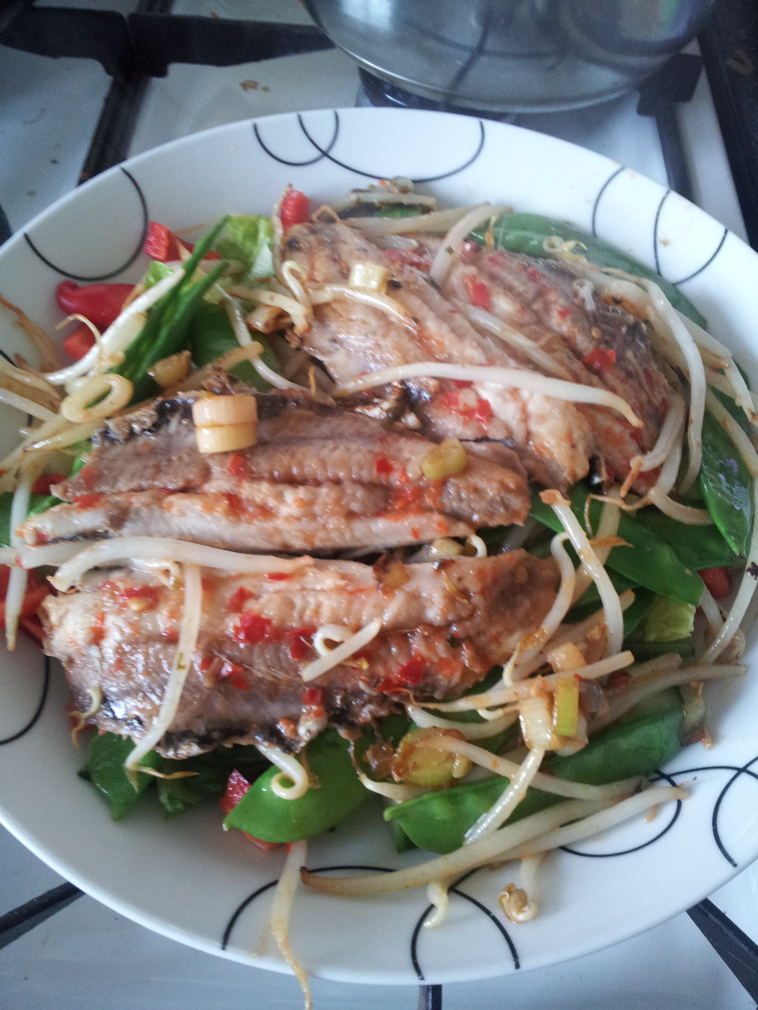 I butterflied the sardines and then pan fried them in chilli and lemon juice. I also added spring onions, mange tout and beansprouts. I served it all on top of salad.