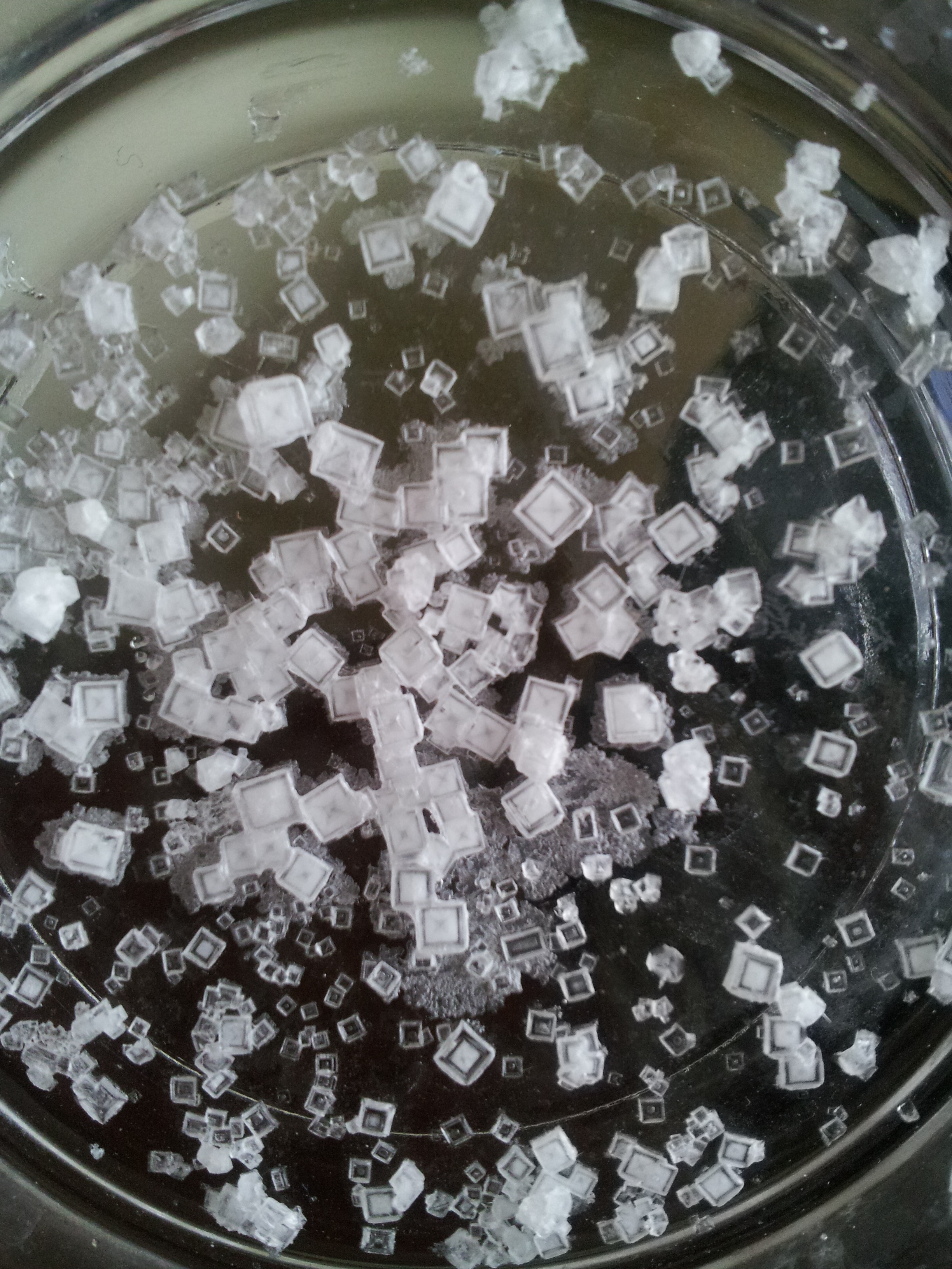 Over a few days you will observe the water going down, and the salt particles starting to stick together.