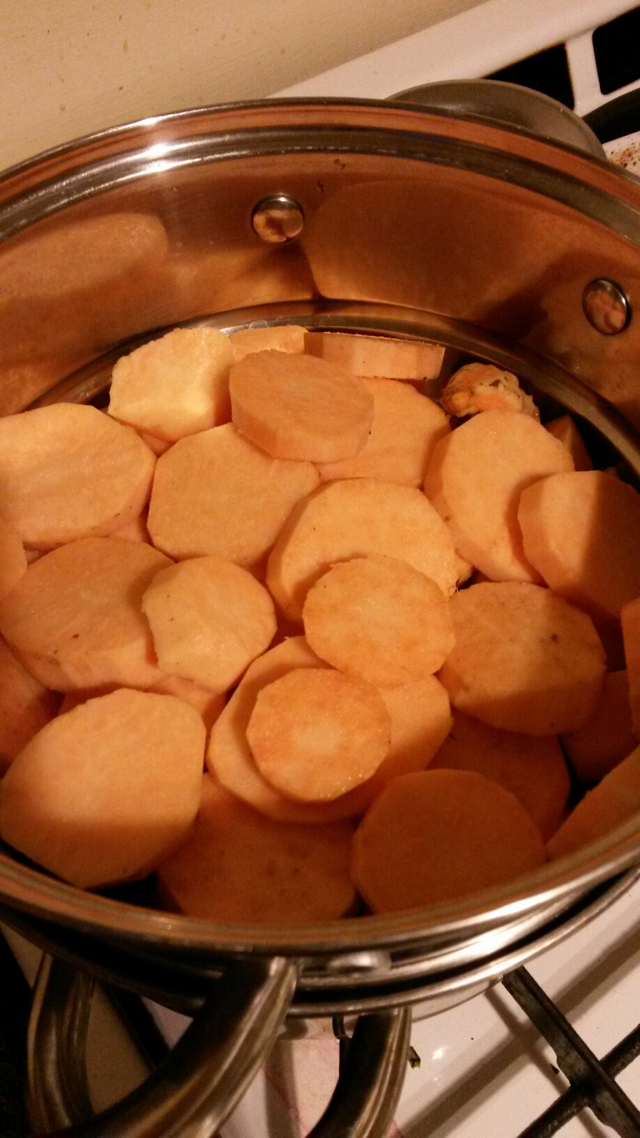 Steam or boil the sweet potato until soft. You can melt the chocolate in a bowl over the pan at the same time.