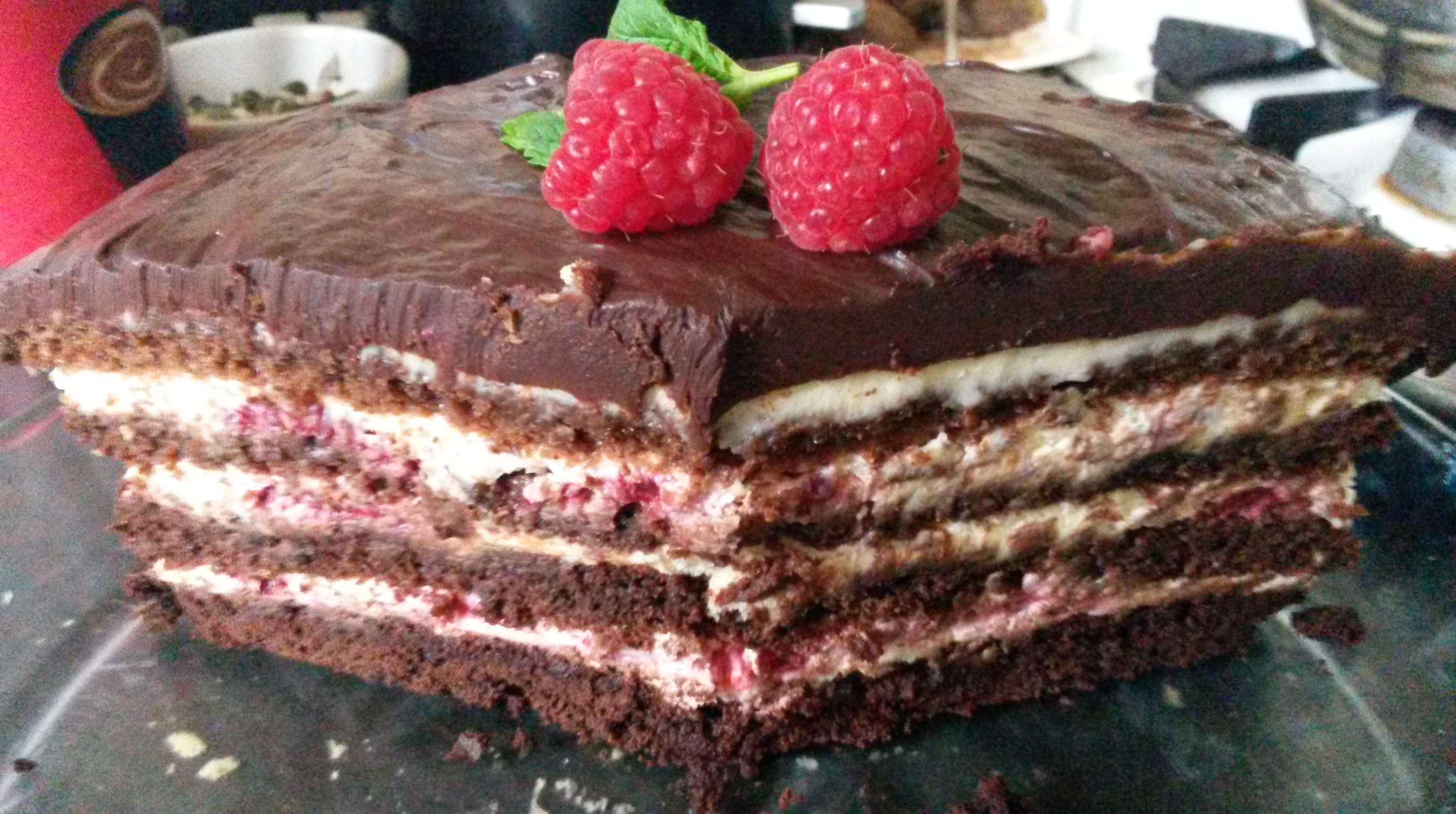 I made this cake for my friend’s birthday this weekend. 4 layers of chocolate sponge with soft cheese frosting, raspberries and chocolate ganache.