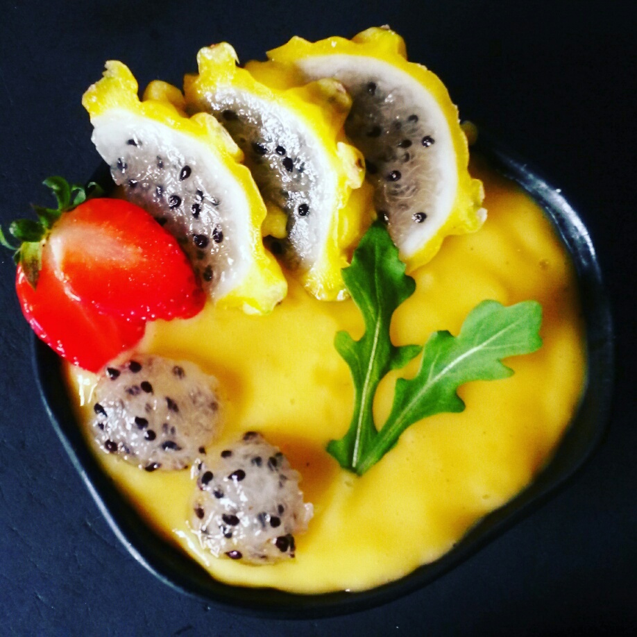 This smoothie is banana, frozen pineapple and fresh mango. Isn’t that bright yellow colour just amazing?! On top is the yellow pitaya, strawberry and a couple of rocket leaves.